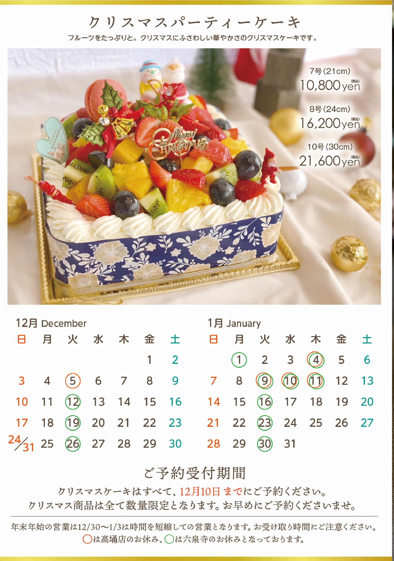 クリスマスケーキの受け渡しは高埇店、六千寺店のどちらでもOK。(店休日は上の画像をご覧ください)