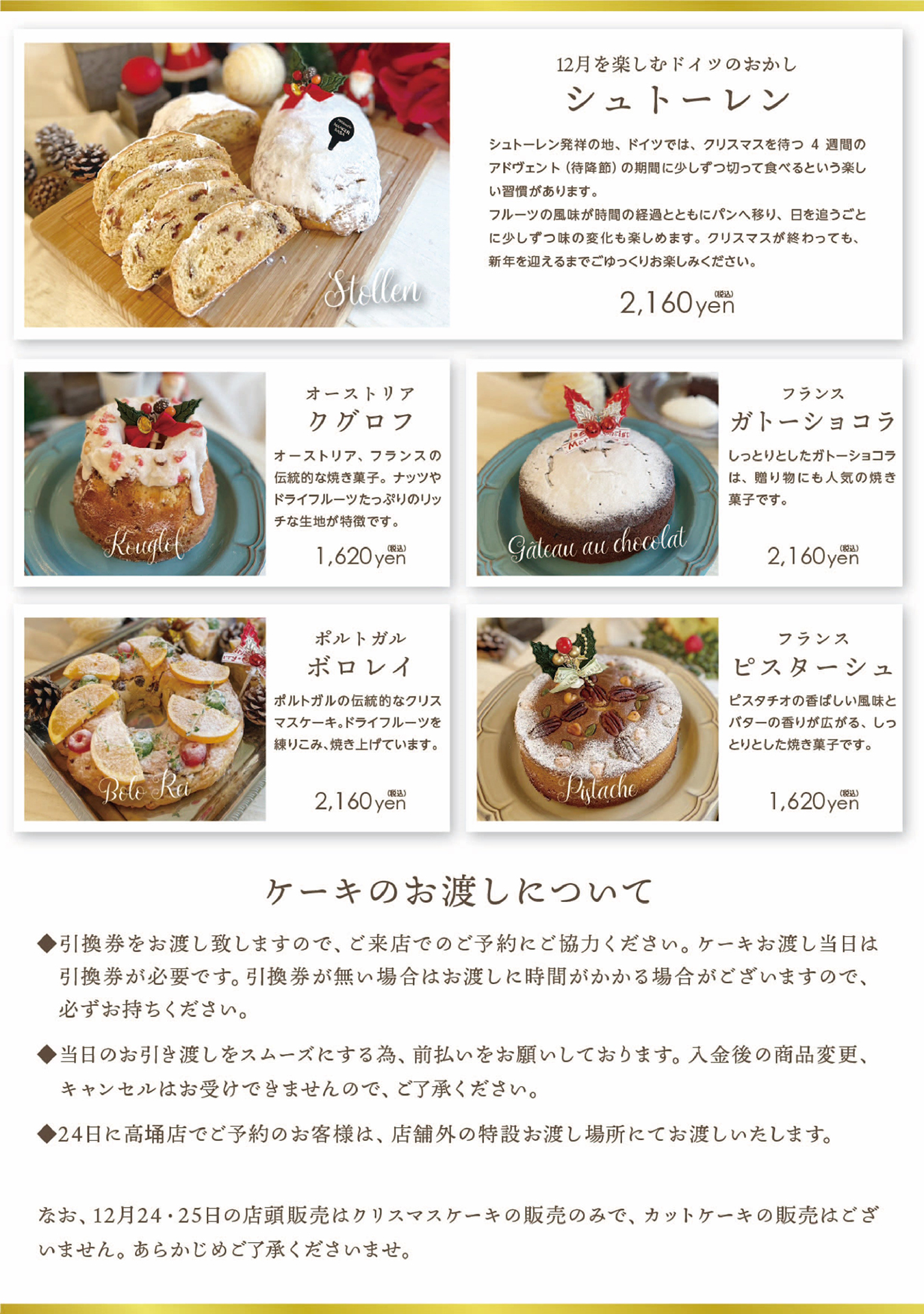 他のクリスマスケーキのラインナップはこちら! チーズケーキ、ガトーショコラ、シュトーレンなど、多種多様なクリスマスケーキがズラリ。どれも可愛くて悩みがいがありますね! 台数に限りがあるので、売り切れてたらごめんなさい。
