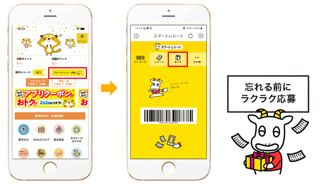 5.コープアプリからスマートレシートのページを開き、「おトク」メニューの「キャンペーン」または届いた電子レシートから応募