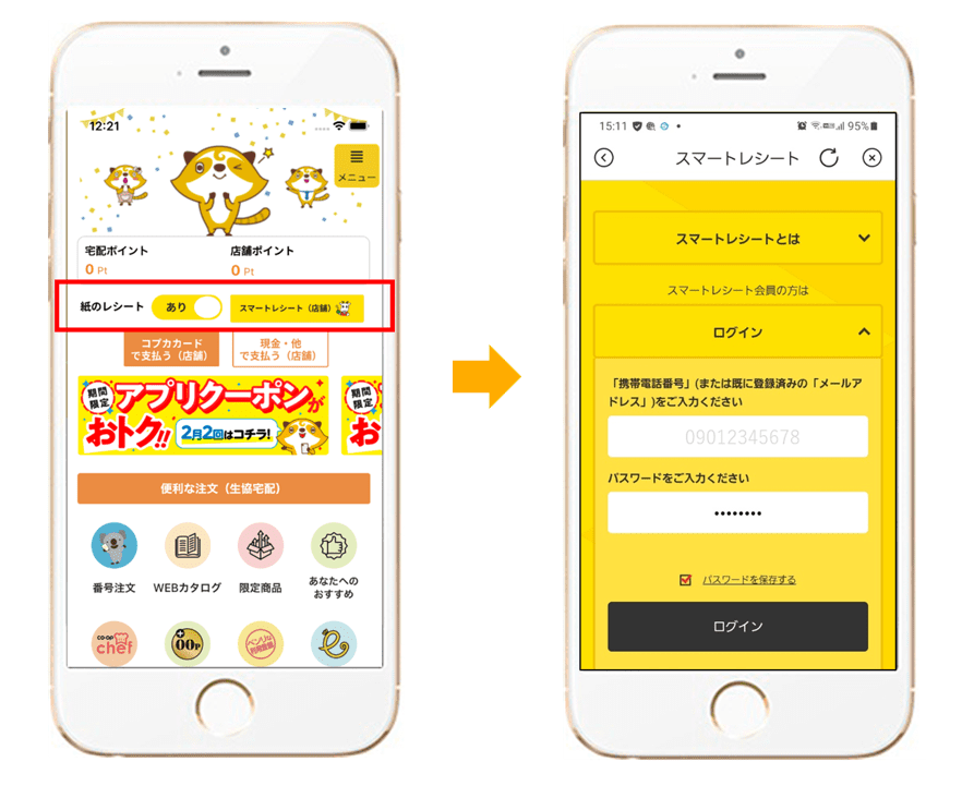 2.コープアプリを開いて、スマートレシートをタップして利用できるか確認