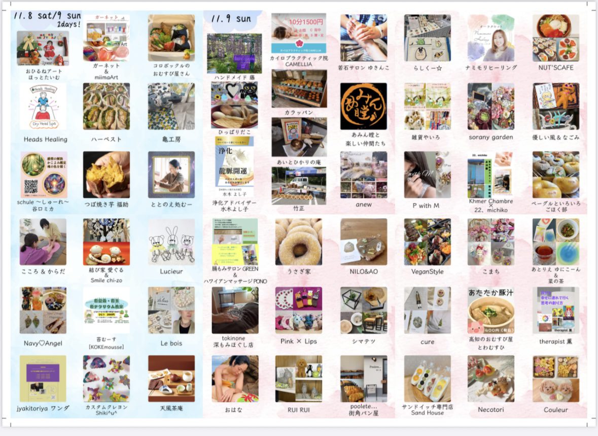 プリザーブドフラワーを中心にダンス、音楽、絵、食べ物、雑貨、マッサージ、占い、癒しの空間、ハンドメイドなどなど様々な出店が集合。