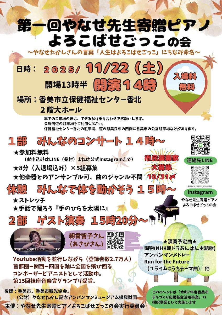 問い合わせ/090-3920-7277(やなせ先生寄贈ピアノよろこばせごっこの会 桑村)