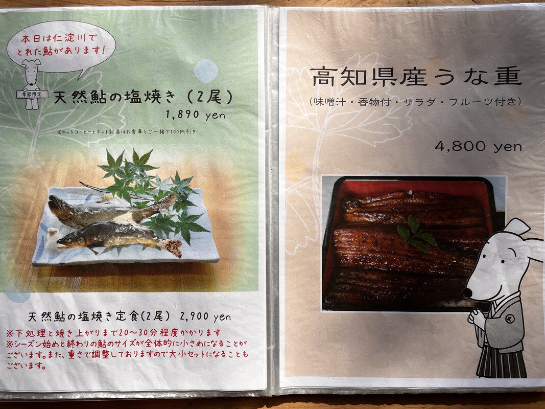 翡翠色に輝く仁淀川の清流や木々を眺めながら、山川の恵みを堪能できる「あおぎ」。