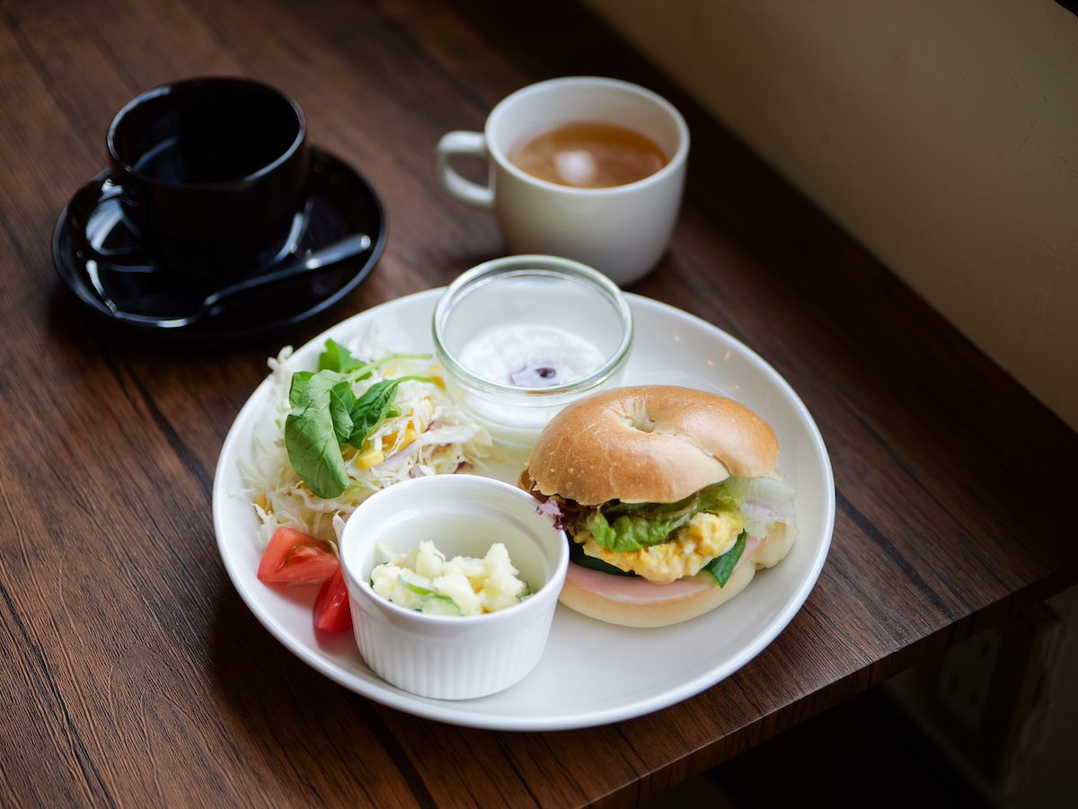 対して、バターも卵も使わない生地で焼き上げたベーグルを添えた、ヘルシーなひと皿。