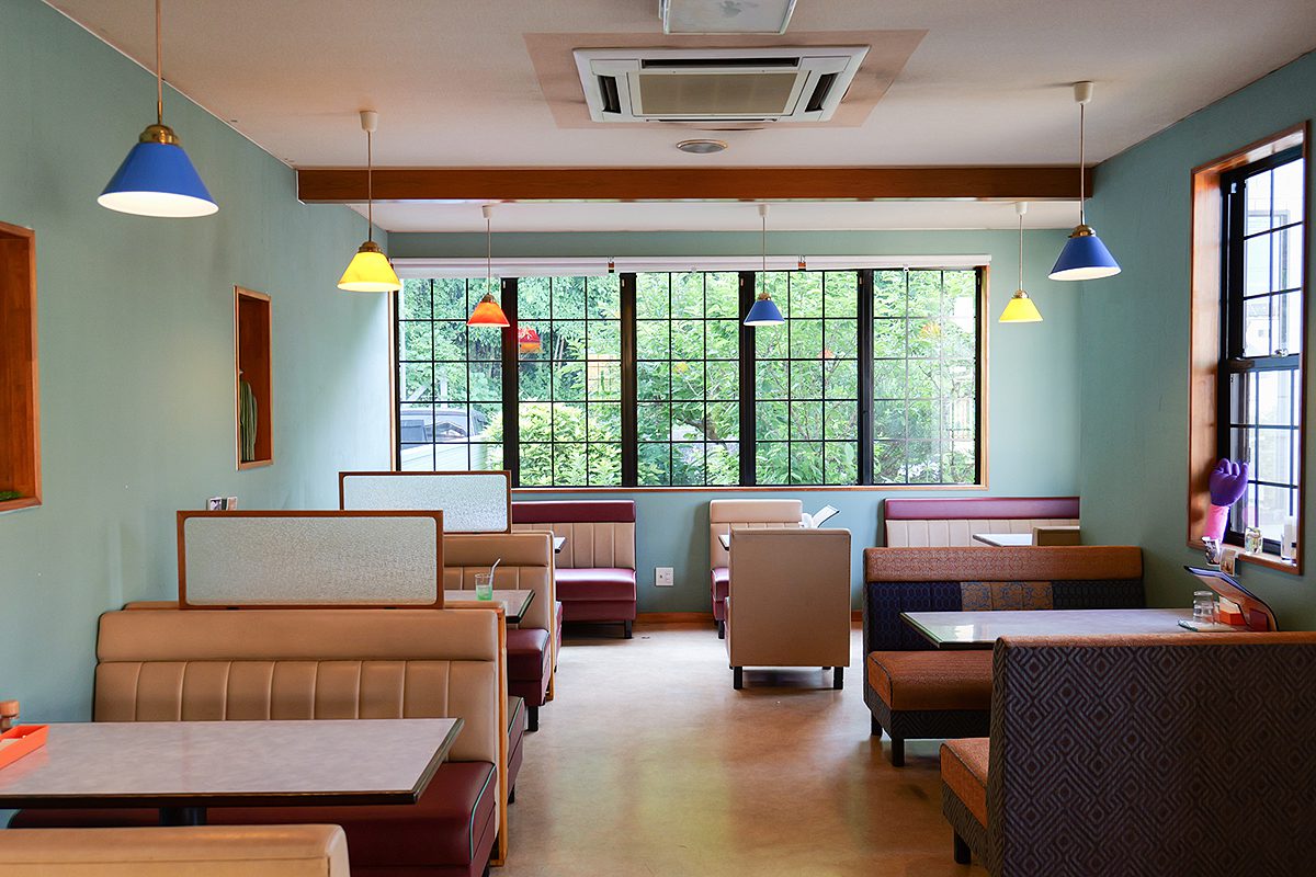 大きな窓から木漏れ日が差し込む、広々空間の店内。
