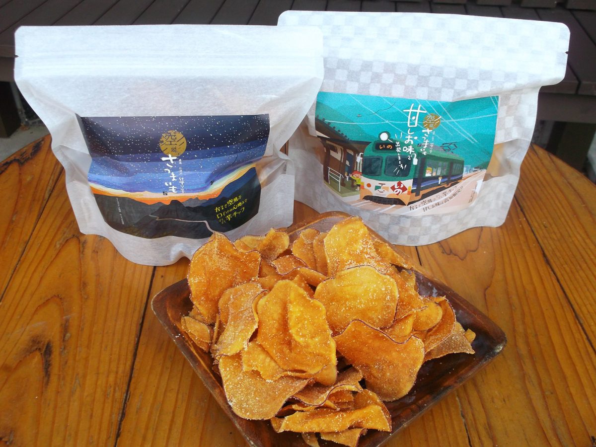 極限まで薄くスライスされたさつまいもチップス「空飛ぶさつまいも」と、やさしい甘じょっぱさが特長の「空飛ぶさつまいも 甘しお味で出発しまーす!」のセット。どちらもふわりと軽い食感で、てんさい糖の優しい甘さが口いっぱいに広がる。(定価1,340円)▶旅ぱすポイント利用なら140円もお得です!