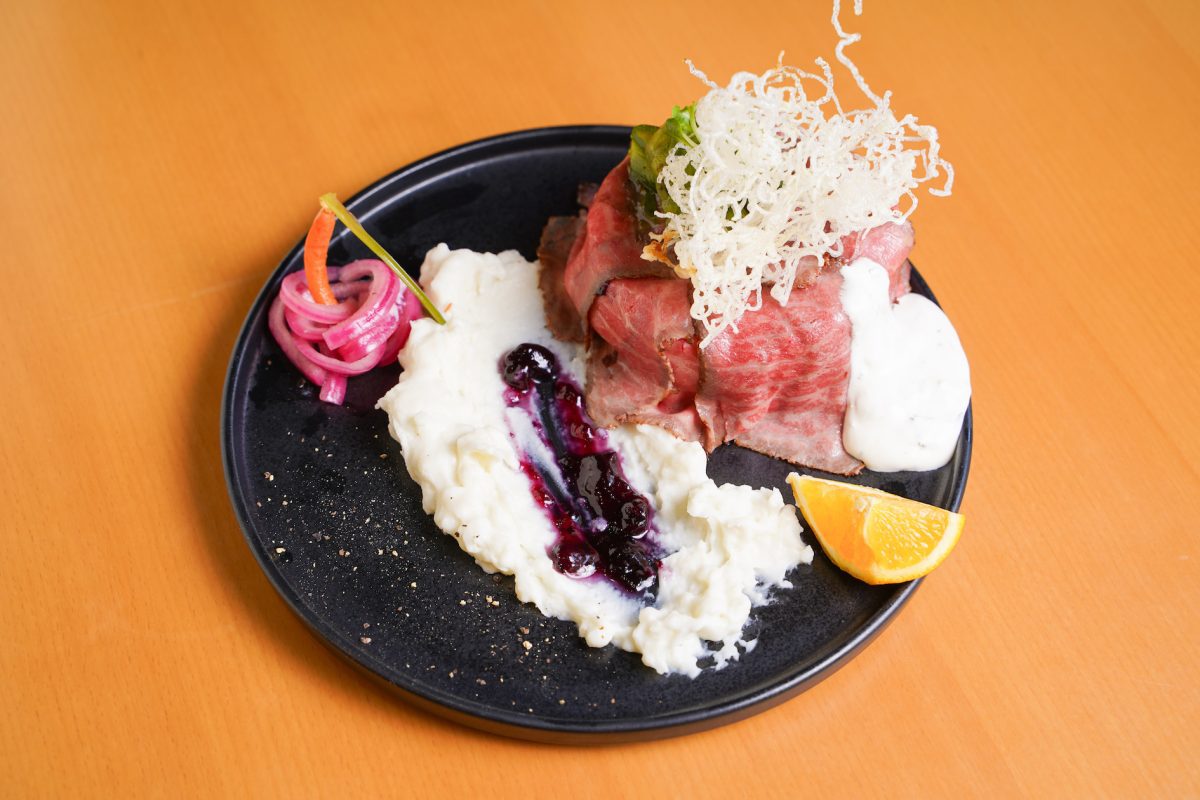 雲の上の町・梼原町にある温泉食堂に、ゆすはら牛が目でも舌でも存分に味わえる看板メニュー「ゆすはら牛のローストビーフ丼」がある。雲の上の町を描いた映え肉ワンプレートで。ゆすはら牛のローストビーフに、季節野菜のピクルスや、舌触りの良いマッシュポテトなど随所にこだわり、濃厚なハーブヨーグルトソースが決め手! ※数量限定
