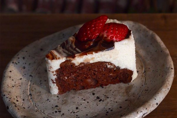 濃厚なチョコソースと生クリームがたまらないシフォンケーキ。トッピングでイチゴを追加できるのでぜひ。