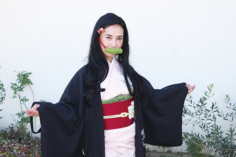 自前の着物で「禰豆子」になりきる女将の来國さん。「なりきった後はそのまま食べて、高知のちくわ丸かじり文化も若い世代の人に楽しんでほしい」と話してくれた。