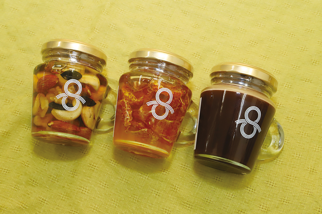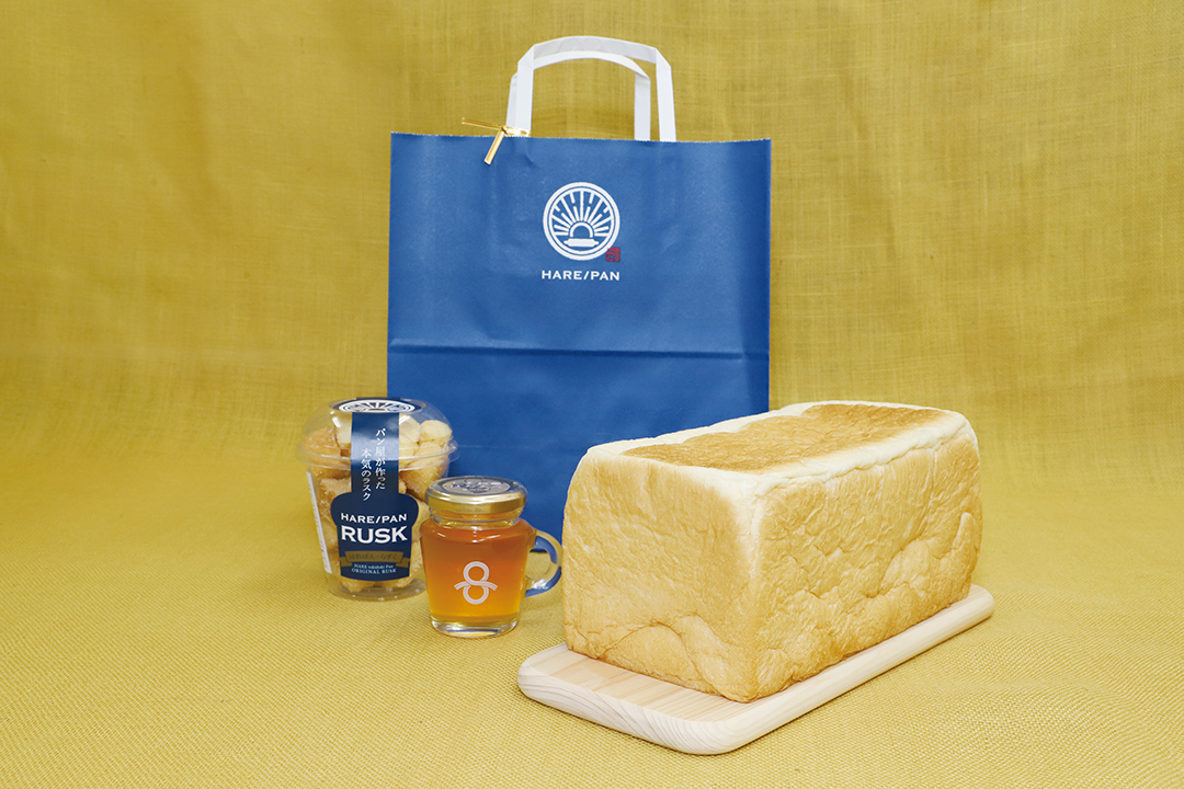 看板商品の「HARE/PAN」(2斤864円)、生食パンを贅沢にラスクにした「HARE/PAN RUSK」(486円)、100%純国産蜂蜜の「万花蜜」(各種1620円)ナッツ、みかん、チョコの3種はパンに付けても美味しい♪
