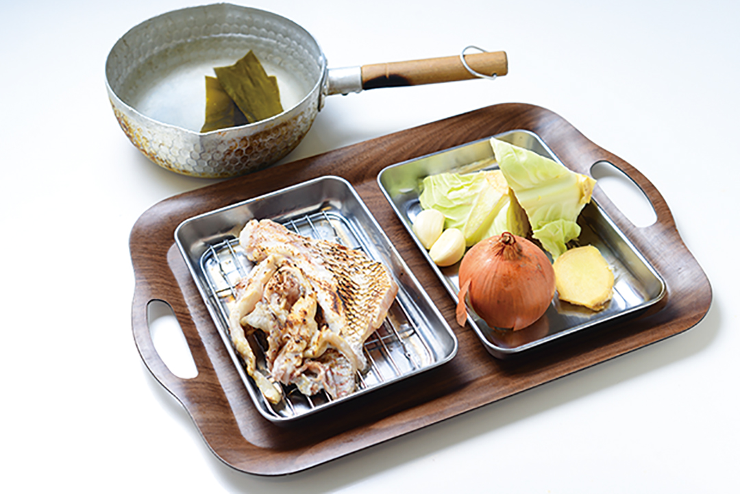 1 臭み取りや香ばしさを出すため、鯛のアラをバーナーで炙るか、グリルやフライパンで焼く。ほかの白身魚やアジ、サバのアラでも代用OK。