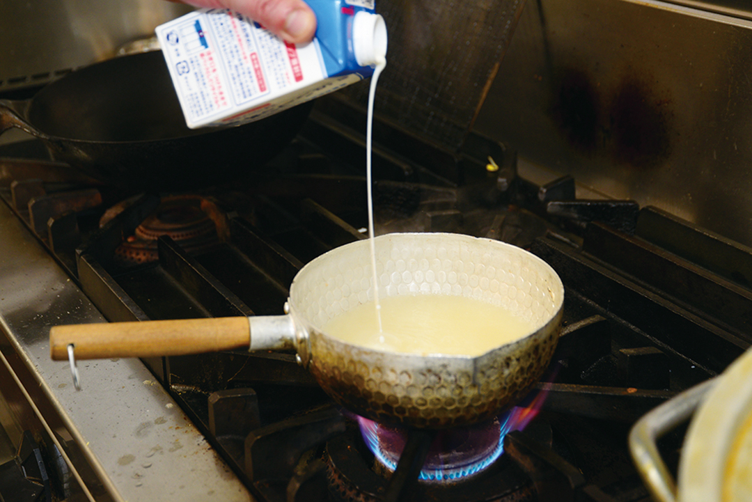 4 スープを再度沸かしながら、牛乳をほんの少し入れる。そうすることでコクや白湯らしい色味が出る。豆乳で代用しても良い。