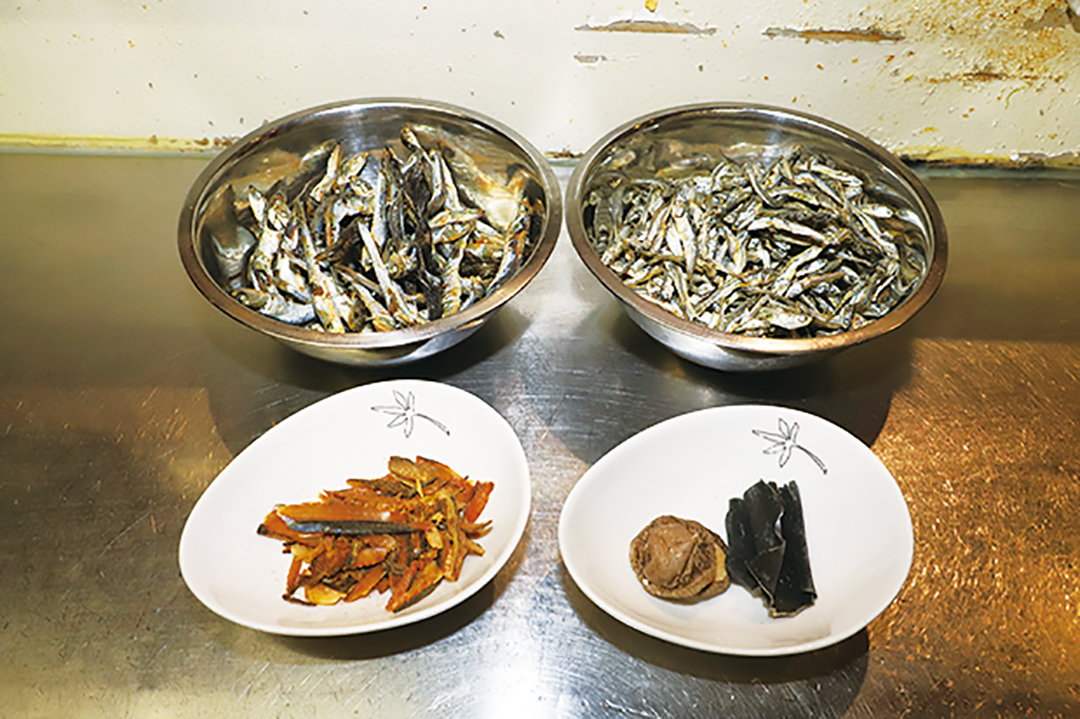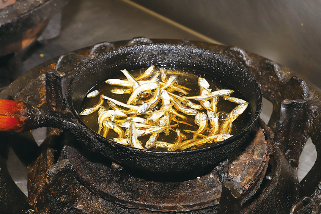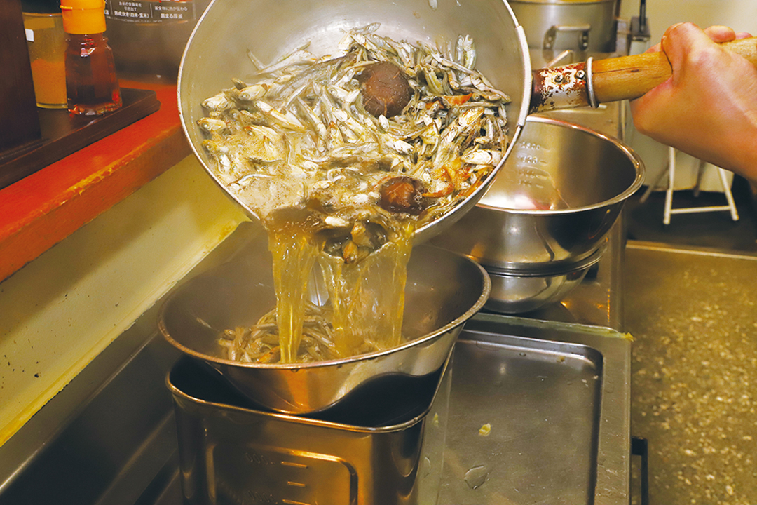 3 次に香味油を作る。ラードを熱し、溶けたら煮干し(小)を入れ焦げないよう弱火で10〜15分熱する。