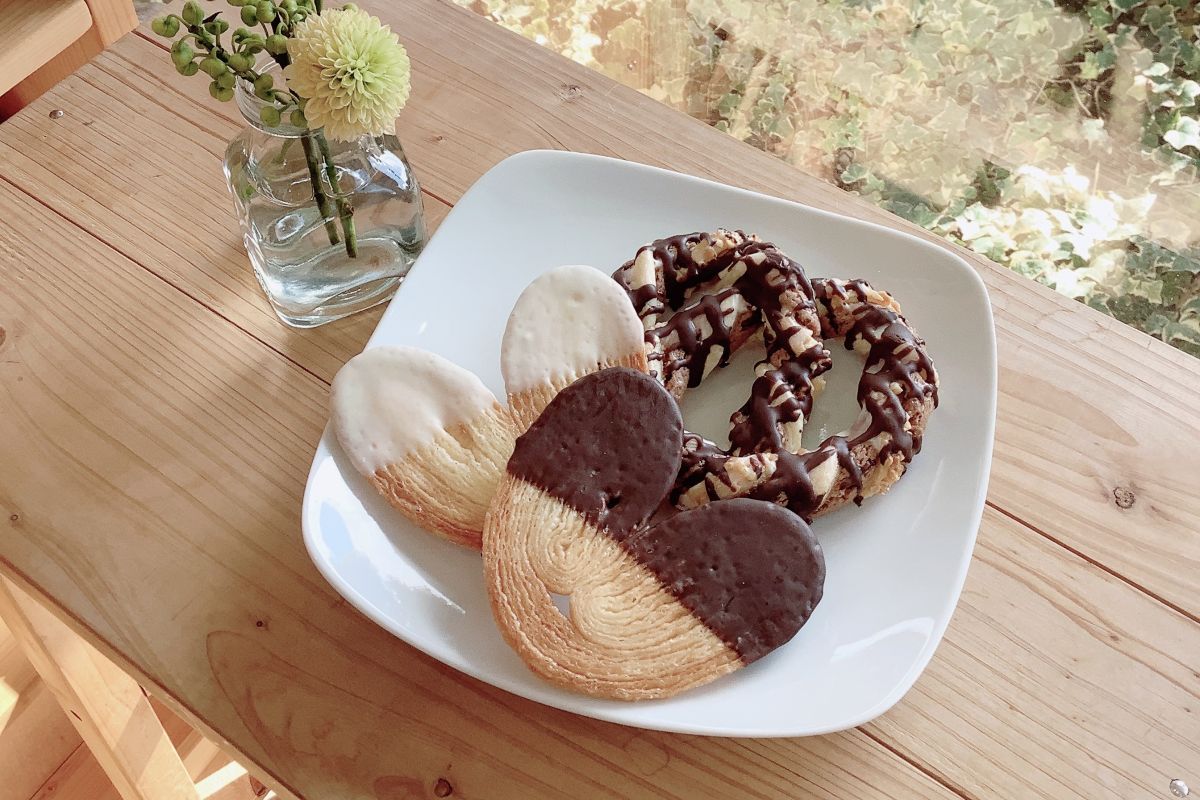 写真右奥にある「ブルグンダープレッツェル(幸福のパイ)」は、サクッとしたパイ生地とココア風味のクッキー、ふたつの味が合わさったドイツ菓子。