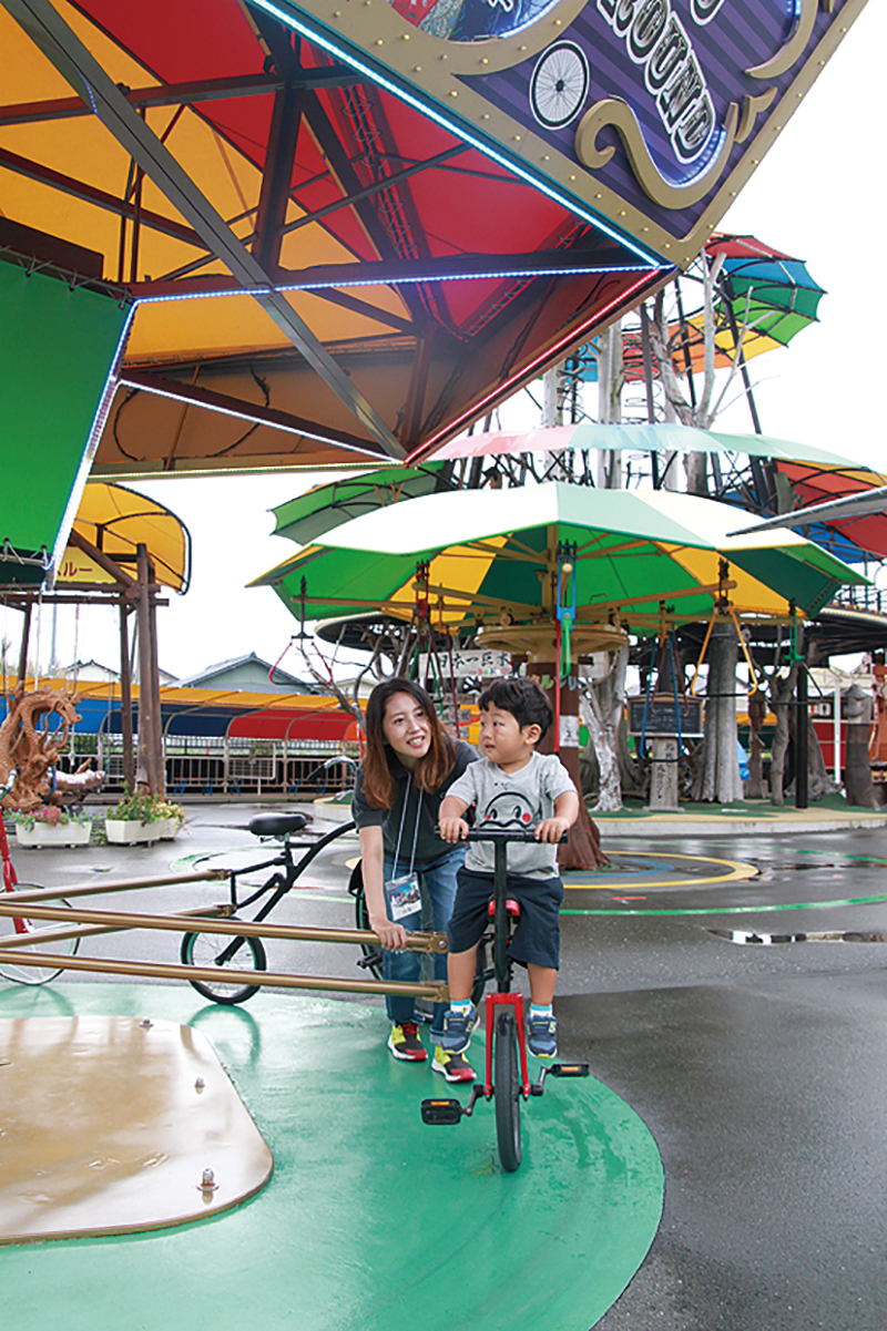 体を使ってダイナミックに遊ぶ遊具が目立つものの、未就園児でも楽しめる遊具もたくさん♪ ママが頑張って自転車を漕ぐと、少しずつ上がっていく人力観覧車に子どももドキドキ。