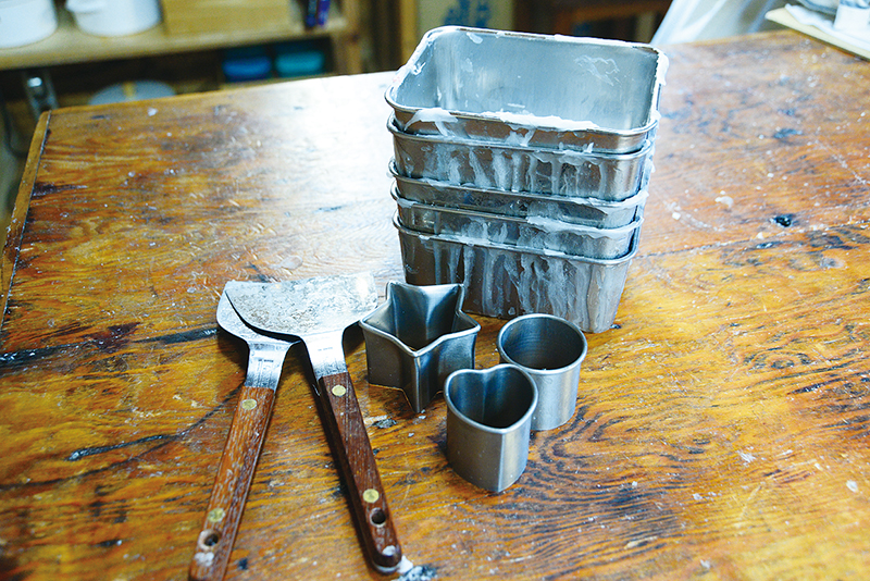 まずはサンプルを使ったデモンストレーションで、形や大きさ、作り方を確認。バットにカラーブロック(色付きのろう)をしっかりと敷き詰めて、そこへ高温のろうを流し込み、取り出したら、型抜きやカット、手ごねで形成していく。