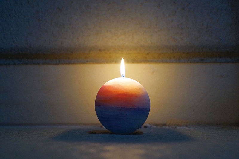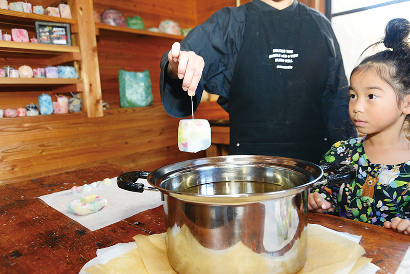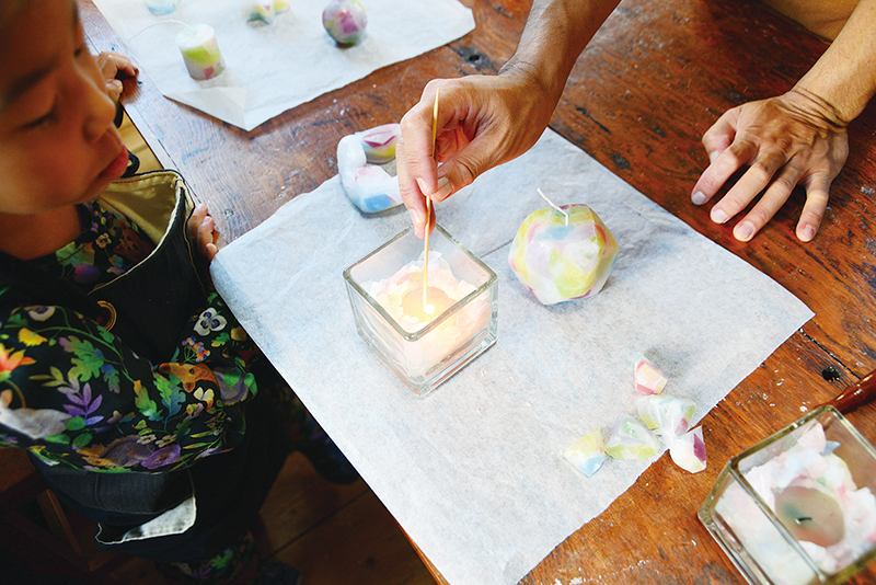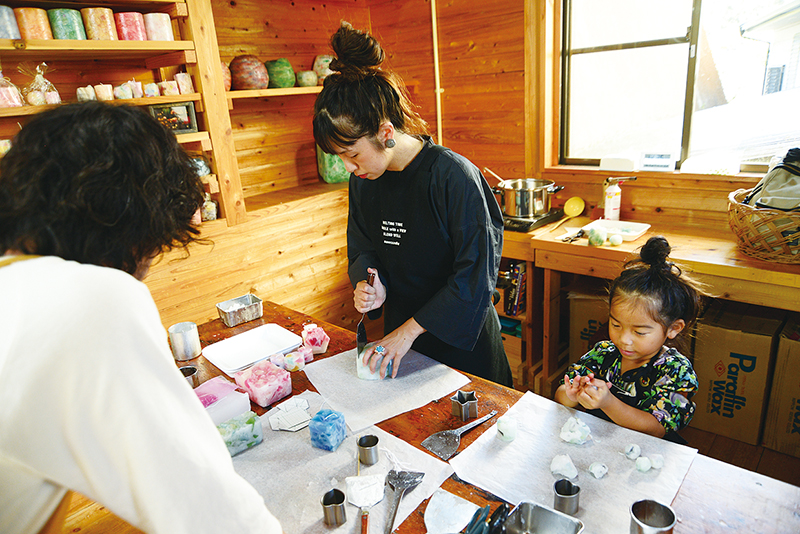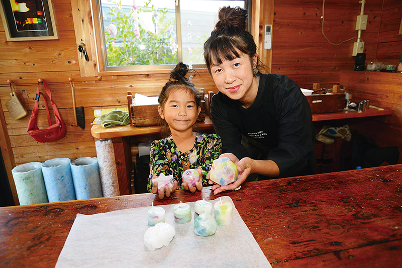 やってきたのはこちら! 階段を上った先にあるログハウスの「モーキャンドル」万々アトリエ。室内へは靴のまま入ってOK。作業の時は汚れても大丈夫な服で参加がおすすめ。大人用エプロンは貸し出し可能。お子様用はサイズに合ったものを持参してね。サンプルを使ってのデモンストレーション。きれいに仕上がるコツや、形のつくり方などを、丁寧に説明してくれる。色彩豊かなカラーブロック(色付きのろう)を、バットの中に敷き詰めていく。隙間なく並べることが、きれいに仕上がるポイント。「クリスマスやお正月、虹や海など、まずキャンドルのテーマを決めてから色を選んでいくといいよ」と、モーさんからのアドバイス。カラーブロックにろうを流し込み、15分くらいで取り出す。そしてここからの作業は時間との勝負! 完全に固まる前に形成作業開始!手でこねたり、ヘラでカットしたり、型抜きをしたり♪ 断面の風合いを楽しみながら、イメージのキャンドルへと近づけていく。芯を通したら、いよいよ仕上げの工程へ。キャンドルを溶かしたろうの中に2秒間つけ、ゆっくり引き上げる。艶を出して芯を固定。「できたー!」気持ちを込めたイメージが形になった幸せ。「ママ、もっとたくさん作りたい~♡」と嬉しそうなゆずかちゃん♪最後にラッピンング。カラーブロックやマスキングテープを使い、可愛く仕上げてプレゼントやインテリアにするのもおすすめ。キャンドルは消し方が大事。液化したろうの中に、芯を倒して消し、再度起こす。そうすることで、最後までキャンドルを使いきれる。サーフィン好きの友人に向け、サンセットをイメージして作られたキャンドル。灯し、溶けていく様が波型になるよう計られている。