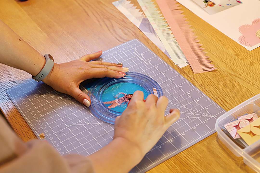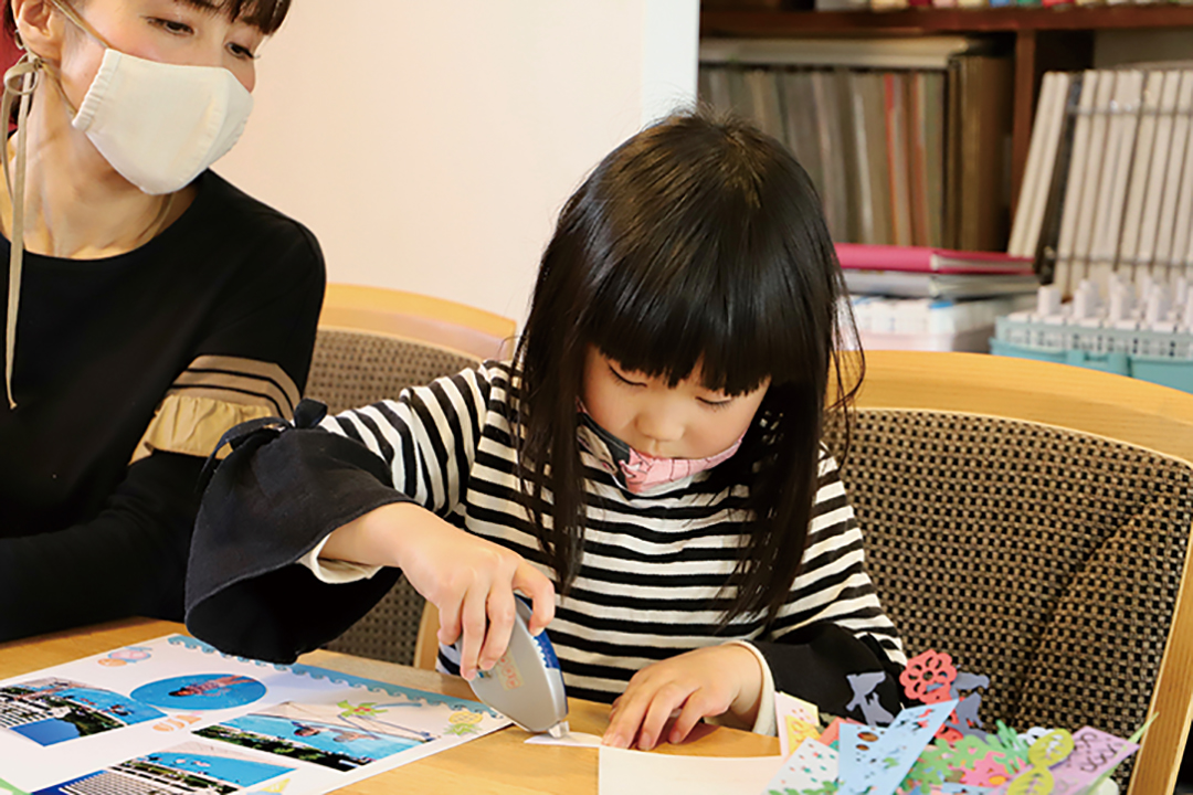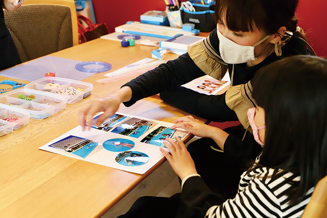 アルバムアドバイザー太田先生によるスクラップブッキング教室を体験。写真を持参して、親子で一緒に写真のデコレーションが楽しめると人気の教室。今回は白田さん親子が挑戦♪ 思い出や気持ちを、見える形でアレンジしてみよう!