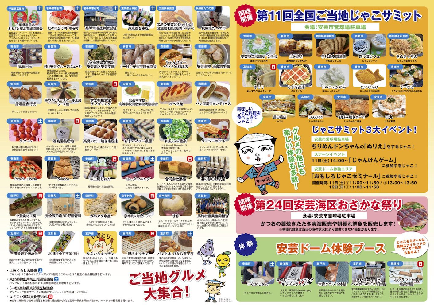11日(土)にはお笑いコンビ「ダーリンハニー」の吉川正洋さんによる鉄道トークショーやごめん・なはり線キャラクターショー、12日(日)には「それいけ!アンパンマンショー」などステージイベントも盛りだくさん! また、南国市から東洋町まで11市町村のグルメが大集合するほか、ちりめんじゃこを使ったグルメが集まる「第11回 全国ご当地じゃこサミット」や、クイズラリーの正解数に応じて参加できるガラガラ抽選会などの催し物も多数。12日(日)のみ開かれる「鉄道の日」記念イベントでは車両基地見学のほかレールスター乗車体験もあり。
