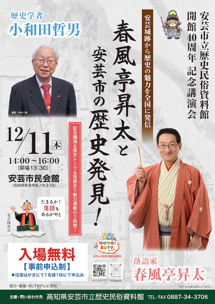 「安芸市立歴史民俗資料館」の開館40周年を記念して、安芸城の魅力に迫る講演会「春風亭昇太と安芸市の歴史発見!」~記念講演・歴史トーク・昇太師匠の落語あり、見どころ満載の2時間!~を開催。