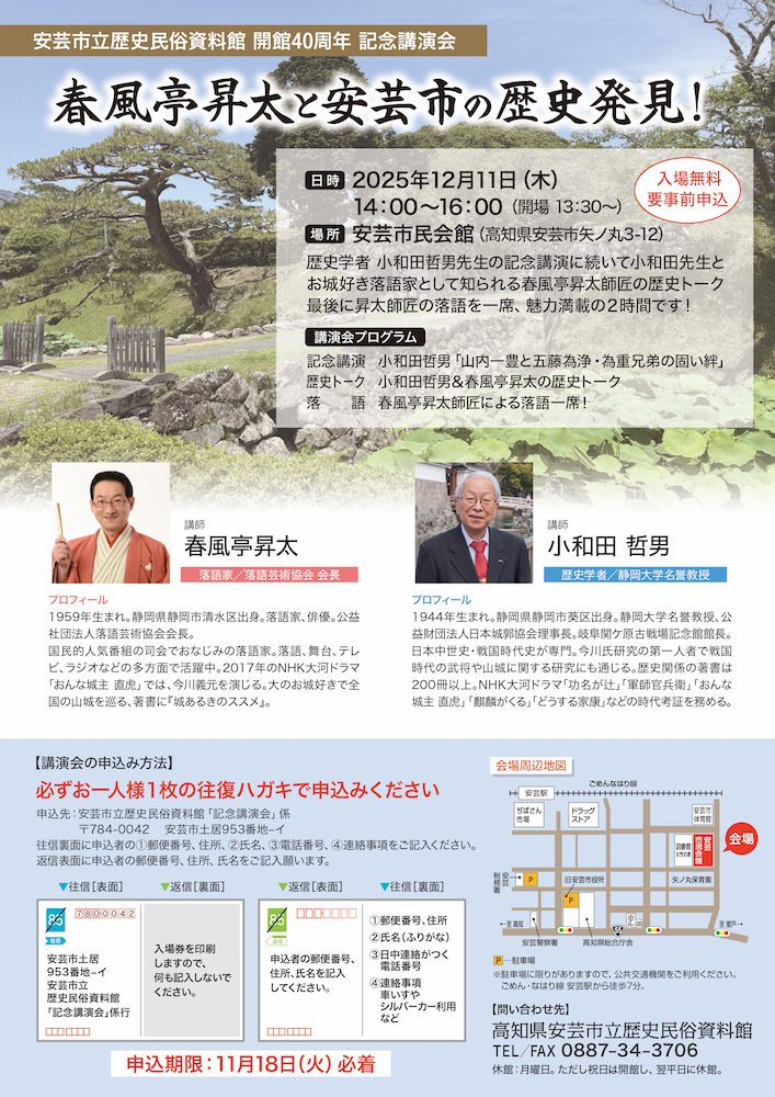 「安芸市立歴史民俗資料館」の開館40周年を記念して、安芸城の魅力に迫る講演会「春風亭昇太と安芸市の歴史発見!」~記念講演・歴史トーク・昇太師匠の落語あり、見どころ満載の2時間!~を開催。