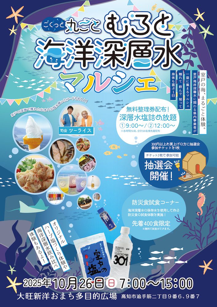 室戸海洋深層水に関わる県内事業者が一堂に集まる「ごくっと丸ごとむろと海洋深層水マルシェ」が今週日曜日に「大旺新洋おまち多目的広場」にて開催される。