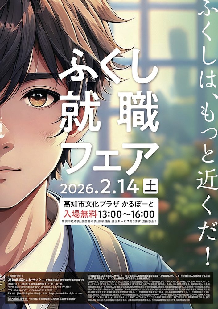 2月14日(土)の「高知市文化プラザ かるぽーと」にて行われる「ふくし就職フェア Winter」では、県内の法人による福祉の職場で働く魅力やPRポイントのプレゼンテーションを実施。また、専門分野の相談や資格取得の情報を提供するコーナーの設置や、現場で働く若い職員や採用担当者からの職場についての説明を受けられる就職面談コーナーなどもあり(60法人の出展)。