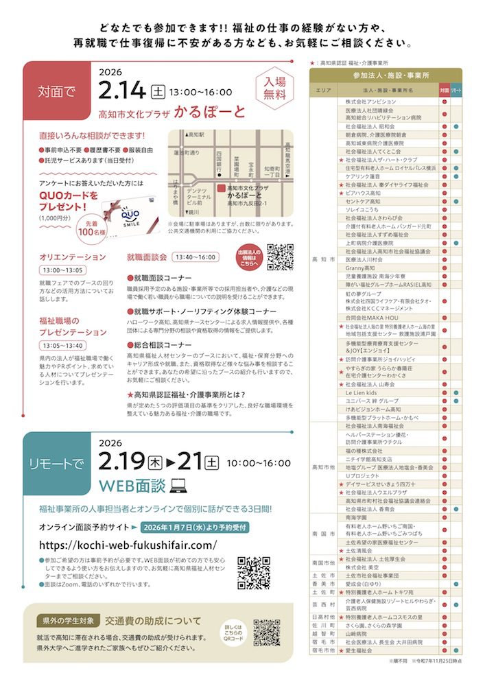 2月14日(土)の「高知市文化プラザ かるぽーと」にて行われる「ふくし就職フェア Winter」では、県内の法人による福祉の職場で働く魅力やPRポイントのプレゼンテーションを実施。また、専門分野の相談や資格取得の情報を提供するコーナーの設置や、現場で働く若い職員や採用担当者からの職場についての説明を受けられる就職面談コーナーなどもあり(60法人の出展)。