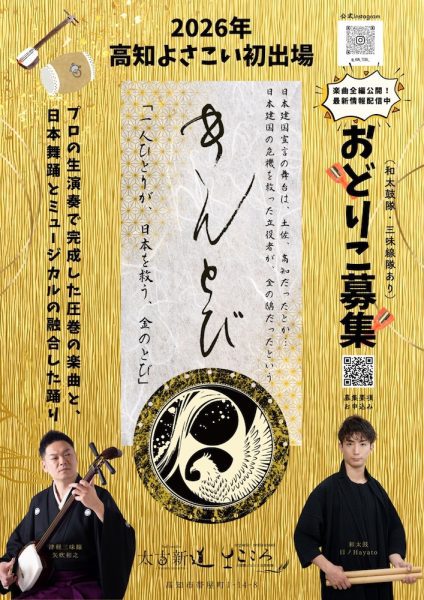 今年、初出場をするよさこいチーム「金鴟 -きんとび-」では、一緒に盛り上げてくれる出演者を募集中! 日本の素晴らしさを感じられるよう金と白を基調とした美しいチーム衣装で、一人ひとりが“日本を救う金のとび”を表現。