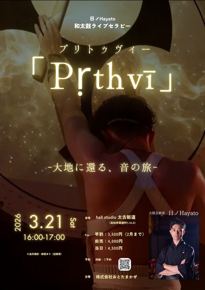 3月21日(土)16時〜17時、帯屋町アーケード内の「hall studio 太古新道 」にて、和太鼓ライブセラピー「Prithvi(プリトゥヴィー)」が行われる。