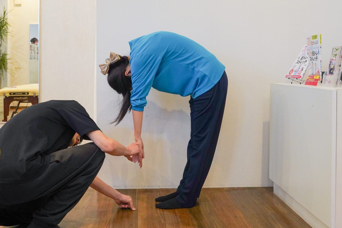 体験前後の記録を撮るために、腰回り・前屈・開脚などの数値確認します。