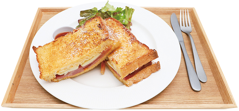 モンテクリストサンド(税別800円)他。こだわりの炭酸水素水も店内で生成。炭酸抜きも出来るので相談してみて。