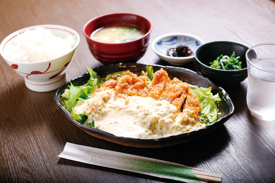 四万十町役場から程近い場所にある「古梵」のランチは、なんといってもボリューム満点! 手のひらほどもある大きな「チキン南蛮」は、オープン当時から継ぎ足している甘めのタレと、ピクルスなどが入った手作りタルタルソースがたっぷり。しっとりしたお肉によく絡み、ご飯も思わず進んでしまう。夜は居酒屋に早変わり!店主が修行を積んだお店の親方から受け継いだという秘伝のタレを使ったジューシー焼鳥で、1杯飲むのもオススメ。