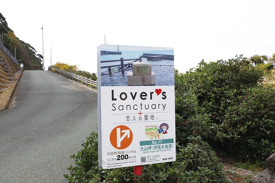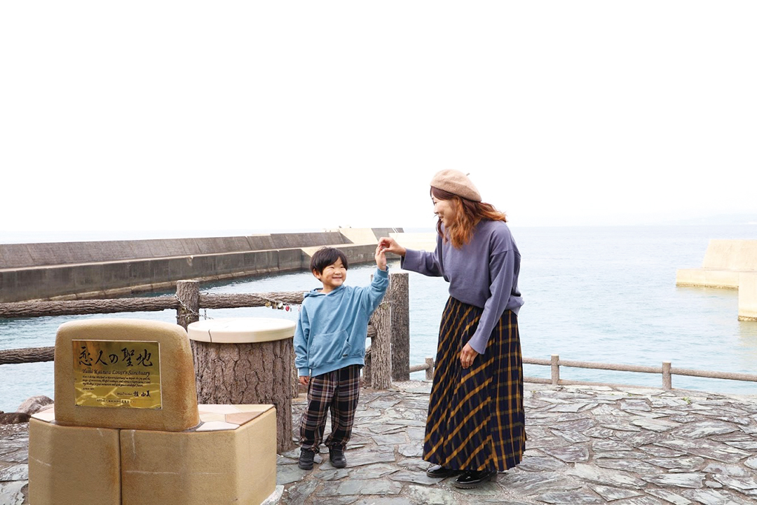 安芸市大山岬にあるラブパワースポット「恋人の聖地」。地域活性化と少子化対策への貢献の両立を図るため、地域の観光スポットを「プロポーズにふさわしいロマンチックな場所」として選定したもの。恋人の聖地のベンチは、安芸市で有名な内原野焼きで作られ、桂由美さんのメッセージも添えられている。まさしくラブパワー全開! ここからの景色も最高で、晴れた日にはサンゴ礁が、冬にはだるま夕陽が見えることも。ベンチに座ってゆっくり過ごすのも贅沢時間。帰りはすぐそばにある「道の駅大山」で名物の「ナスライスバーガー」を食べる、息子とのデートコース。にっこり笑顔が止まらない、ママの幸せ時間を過ごしてみて。