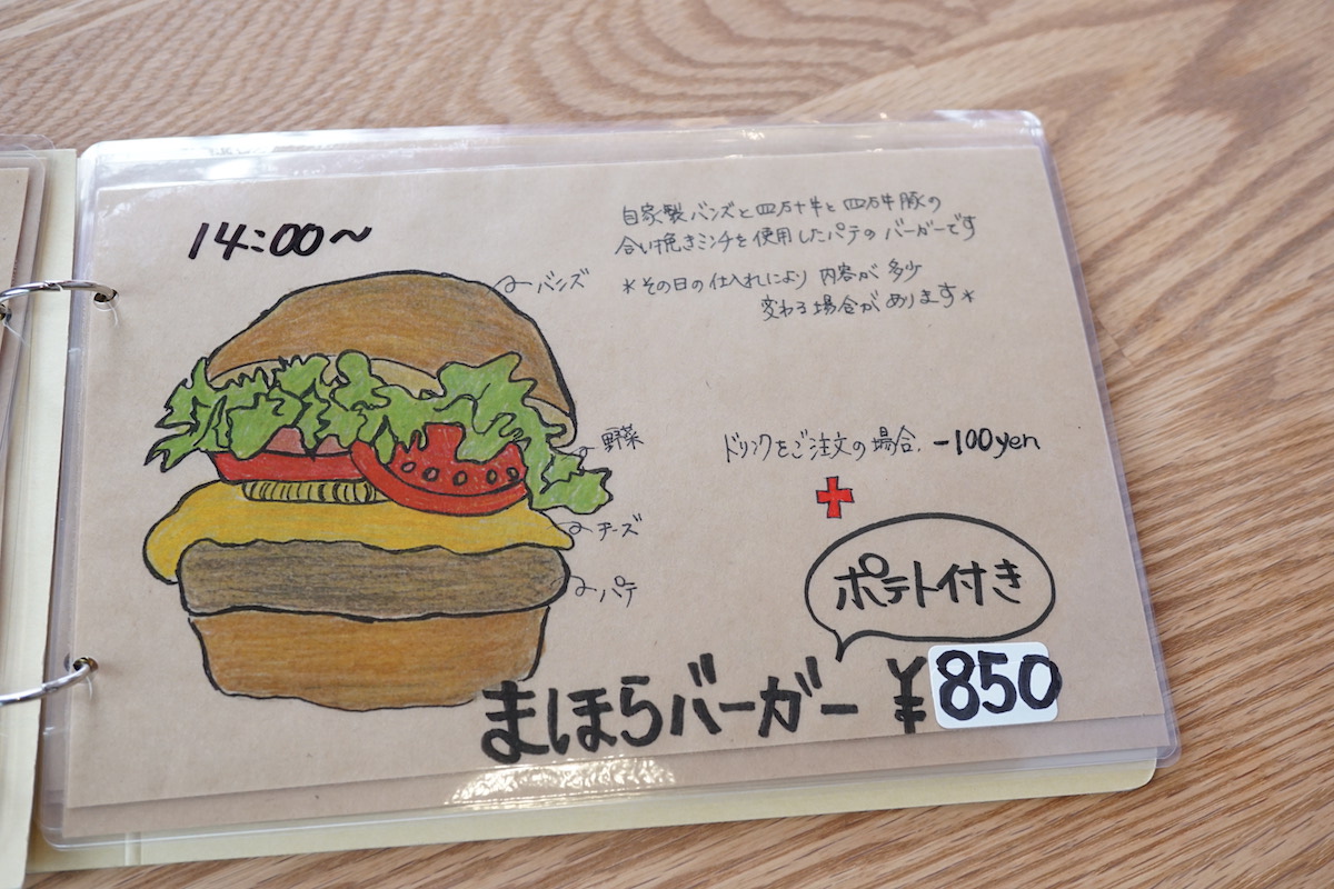 こちらは、14:00〜オーダーできる「まほらバーガー」(850円)。